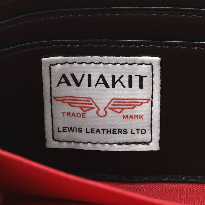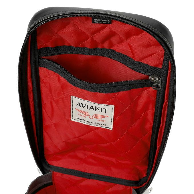 タンクバッグは屋外での使用を想定し、表地にフェイクレザーを、内装にはLewis Leathersならではの発色の良いレッドのキルティング生地を使用しています。Lewis Leathersのロゴを箔押ししたブランドブランドタグやAVIAKITタグを取り付けることで、ライダースジャケットに用いられる仕様をバッグに落とし込んだスペシャルアイテムです。