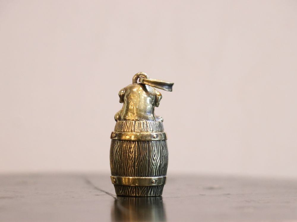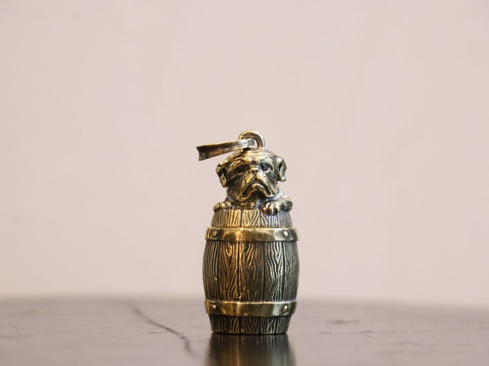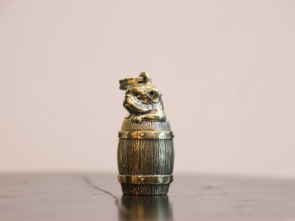 樽からブルドッグがひょっこり顔を覗かせている、なんとも可愛い真鍮性のアクセサリーです。